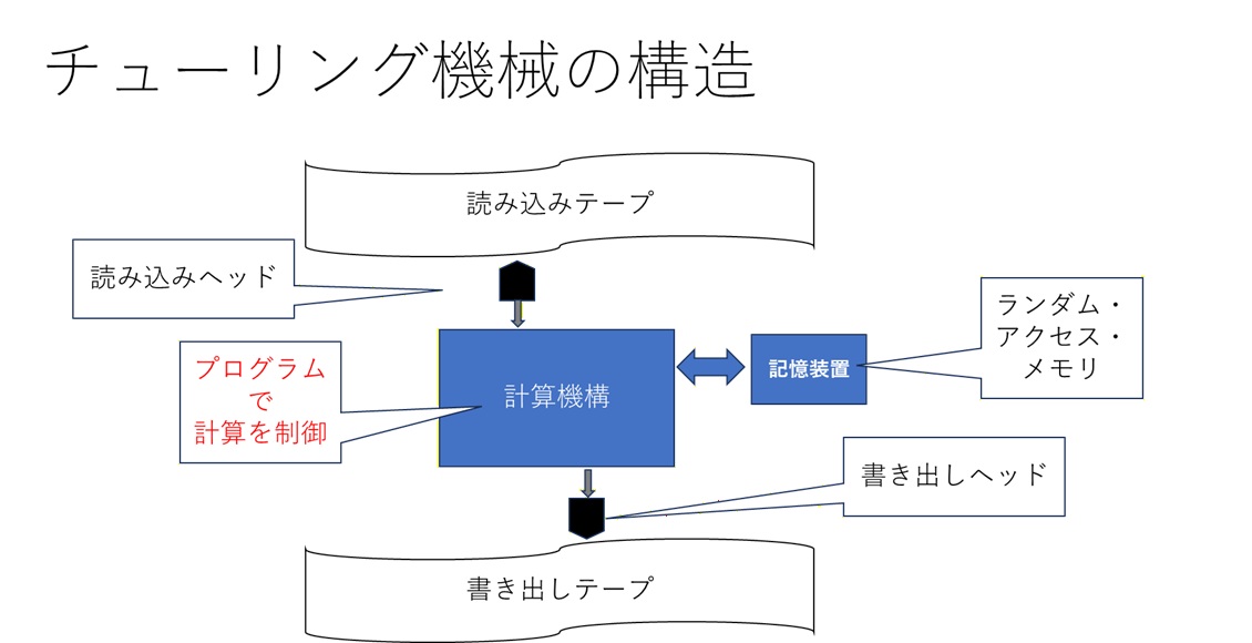 バッベージの夢は、実現することができませんでしたが、その後、数学の分野では、イギリスのプールが、論理和や論理積などに基づく、新しいブール演算を考えだし、20世紀に入って、電磁石を使った計算機械を考える基礎が確立されました。そして、イギリスのケンブリッジ大学で計算のやり方を研究していた、数学者のチューリングは、バッベージの機械を抽象化し、数学的に計算を考えるための数学的なモデルである、チューリング機械を考案しました。そのチューリングは、第2次世界大戦中、連合軍を悩ませた、ドイツのエニグマ暗号を解読する計画に参加し、解読に成功しました。その時も。暗号を高速で解読するため、歯車式の計算機械を使っていました。チューリング機械は、入力をテープから読み込み、予め記憶させてあるプログラムに書かれている計算手順に従って、計算を進め、計算結果を出力テープに書き出します。計算の途中結果は、記憶装置の中の記憶セルに書き込まれ、後でその値を読み出すこともできます。