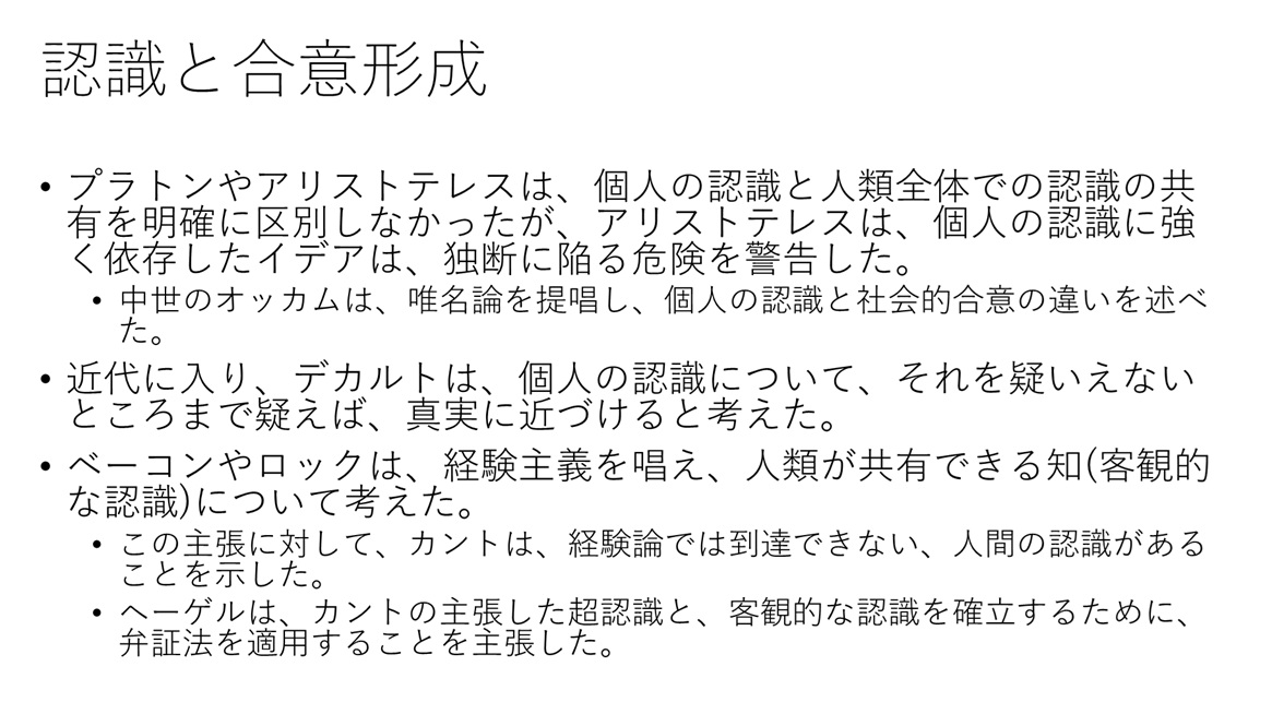 人間同士が言葉を使って意思疎通を図るようになると、話し手個人の思いや認識を話しているのか、客観的な事実を話しているのかの判別が問題になりました。哲学者のデカルトは、個人的な認識を出発点であるとしても、人々が共通に認識できる、客観的な知に到達できることを主張しました。