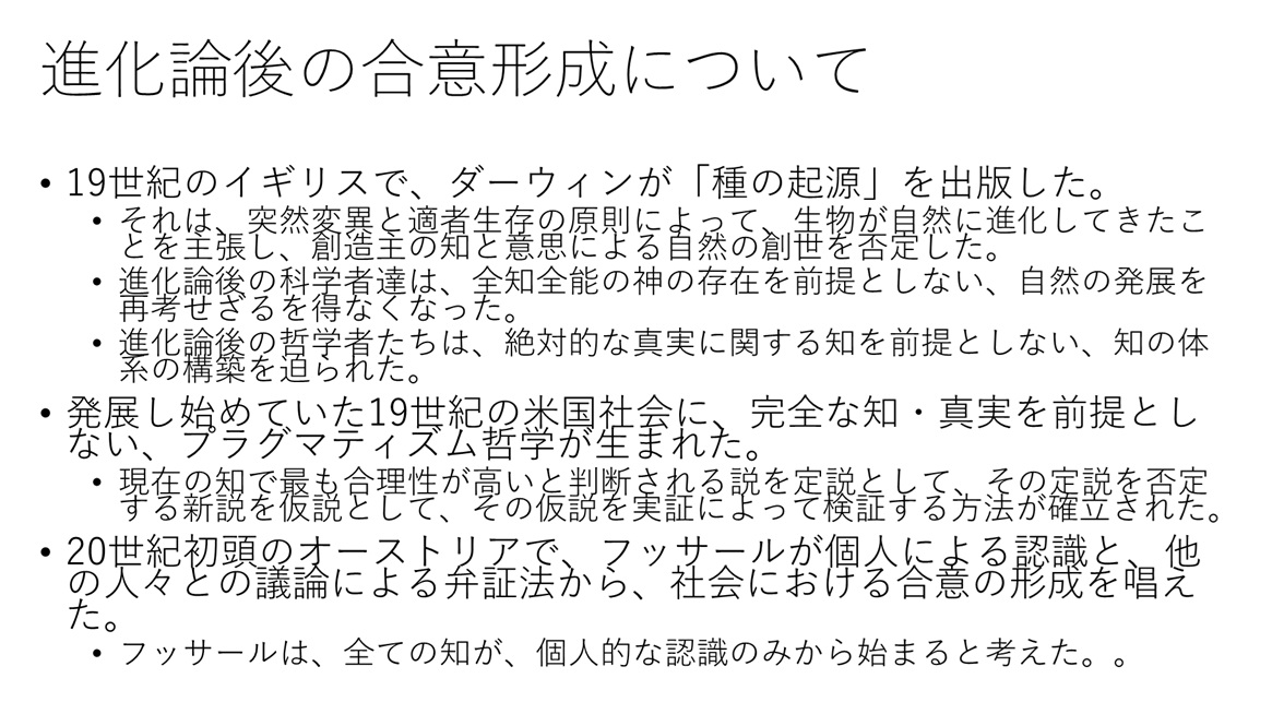 プラグマティズム哲学では、『人間には本当の真実を認識する能力はなく、ただ経験した現実を、単なる「個々の現象」として「あるがまま」に認識する能力しかない』と考えます。それは、イギリスの生物学者、チャールス・ダーウィンが、その著書、「種の起源」で主張した、『生物は、突然変異と、その変異が生息環境に適しているかどうかで、適している変異は生き残り、他は絶滅する」とする原則に従って、進化してきた』とする説が暗示する、人間の知は、『絶対的なものではなく、その時代に真理であると信じられているだけのものである』とする、無神論の主張でした。その人間の認識についての制約の中で、現実に対する認識を、より真実に迫る認識に近づけるためには、現在の知識を改良して、より多くの人が共有できる普遍的な真実に近づいていると考えられる知識にしようとします。この思想が、20世紀の科学技術の進歩を支えた、最も新しい哲学です。