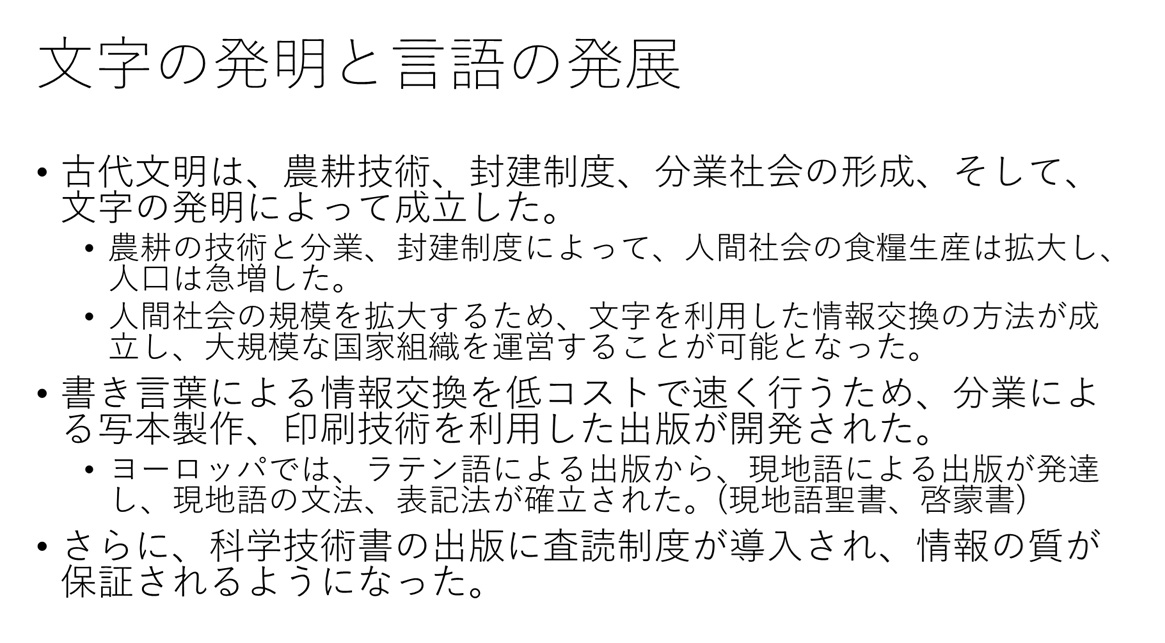 人類の言語の発展過程では、個人の私的な認識と、人類が共有できる客観的な事実の区別以外にも、重要な問題がありました。それは、話し言葉で語られたことを、書き残す技術でした。4大文明が発祥すると、各文明において、書き言葉が発明されました。さらに、その書き言葉を記録し、複写する技術も開発され、改良されてきました。これによって、人類の知は、大きく発展しました。
