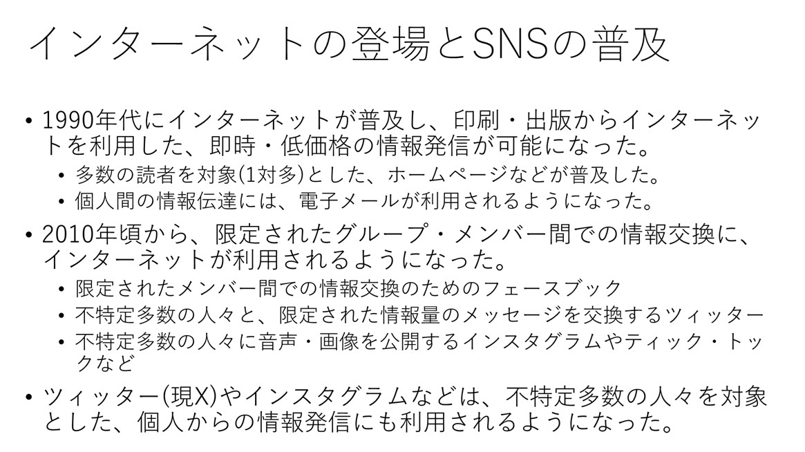 20世紀の中ごろから、これらの文書は、コンピュータを活用したデータベース上に蓄積され、必要に応じて、誰でもその内容を検索し、内容を確認できるようになりました。コンピュータと通信回線を活用することで、地球上のどこからでも、文章を検索し、見つけ出して内容を確認することが、極めて短時間のうちに行えるようになりました。そのことで、世界中で作成される文章を、いつでも、どこでも、自分自身の要求に従って、検索し、内容を読むことができるようになりました。19世紀から20世紀の社会では、印刷技術を活用した、「新聞」などのメディアによって、速報として社会的に重要な情報を、早く、多くの人々に、低コストで提供されていました。20世紀の後半、特に1990年代になると、インターネットを利用して、個人が情報発信者となり、世界の人々に対して、自分の意思で、即座に情報を発信できるようになりました。つまり、20世紀の前半まで、出版社や、放送局などの専門家たちによって、その内容の質を保証できない情報は、自動的に排除されていました。従って、情報の内容についての真偽は、問題になりませんでした。しかし、個人個人が、情報を獲得し、直接、即座に発信できるようになると、その情報の真偽を客観的に保証することが、できなくなりました。