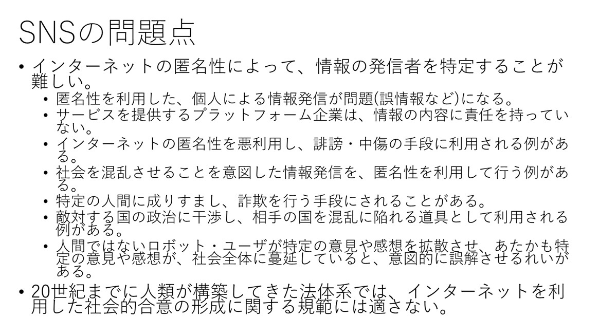 21世紀の初頭になって、インターネットを利用した情報交換が、一般的になり、人々がインターネットを利用した情報交換で、個人の意志で情報を取得することが主たる手段になりました。これによって、個々人が発出する主観的な情報が、第三者の客観的な評価を受けないまま、次から次へと人に伝えられ、巷(ちまた)で言われる「電報ゲーム」のような性質を持ったネットワーク上で、情報共有されることが普通になりました。この主観的な情報の共有が中心となったネットワークが、ソーシャル・ネットワーク・サービスと呼ばれている、インターネット上で提供されているサービスです。それは、主観的な印象だけが優先されるネットワークで、いわゆる「フェーク・ニュース」の流布を止めることが難しい、情報共有の手段です。