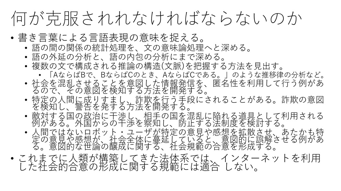 コンピュータが発達し、人間社会に普及し始めると、人間同士の意思疎通のために、コンピュータを利用して、情報交換を安く、効率的に行うやり方が、広まりました。その代表的な例が、インターネットと、それを利用した、ソーシャル・ネットワーク・サービスです。この外形的な技術の進歩だけでなく、人工知能技術を利用した、話し手の意図した意味の把握を目的とした技術の研究も進みつつあります。