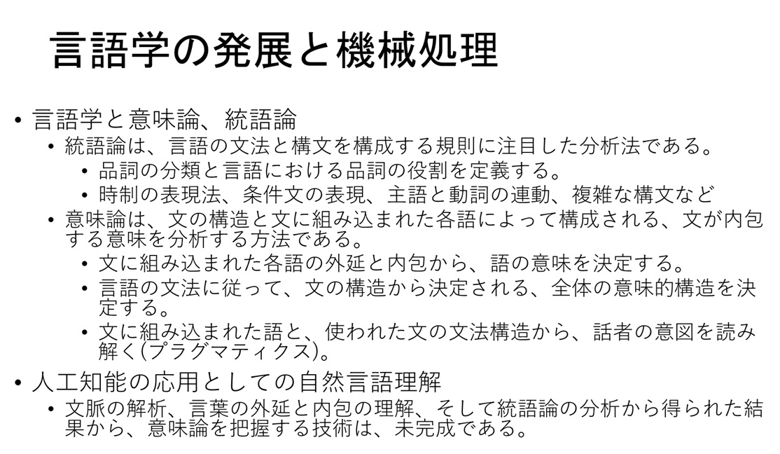 すでに議論したように、コンピュータによる自然言語表現の解析技術は、現時点では、それほど高い水準にはありません。特に、自然言語の意味を確定するための、文脈の解析、「言葉の内包」の意味の把握などについては、研究の進展が遅く、効率的な解析のコンピュータ化を実現するには至っていません。それでも、一般的な場面での自然言語表現の理解と、自然言語でのコンピュータの応答などについては、大きな問題を発生させずに、簡便な方法を使うことで、十分利用することは可能になっています。これは、言葉を話し始めた子供が、その内容を深く考えていなくても、一見、「つじつまの合う」やり取りをすることができることと、似ているからです。