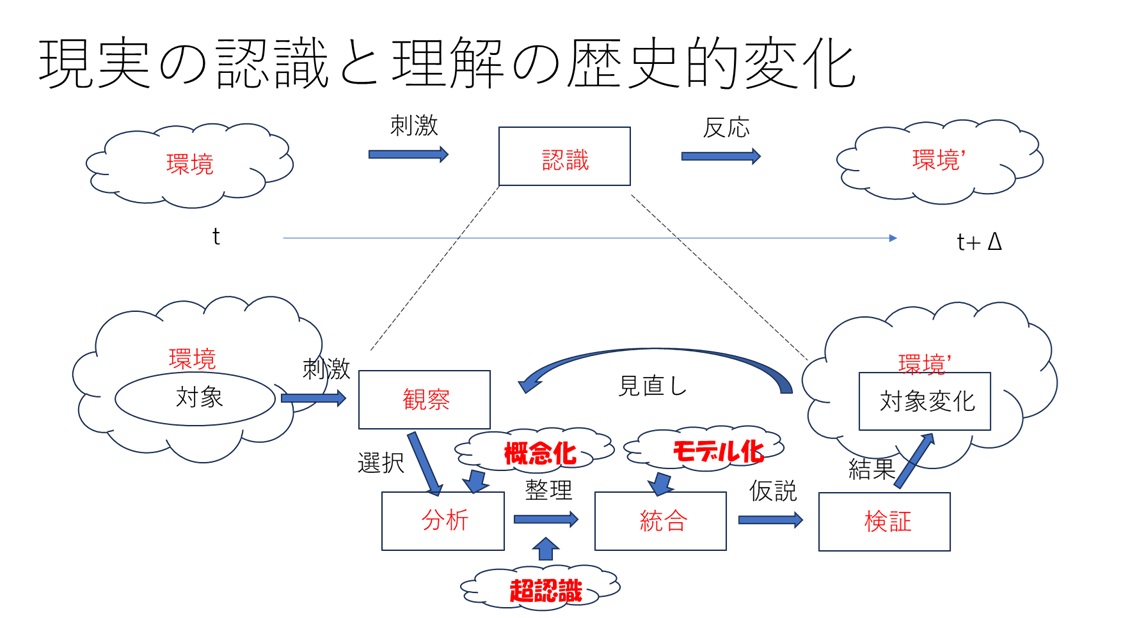 この人間による現実の認識と理解の過程について、哲学者たちは、普遍的な問題を探し出し、3千年近い時間に渡って、議論を続けてきました。その一部を振り返って見ましょう。その最初の一歩は、古代ギリシャの哲学者、プラトンによって踏み出されたと言えます。プラトンは、環境の変化を認識したら、似たような変化を注意深く観察し、それらの違いを見つけて、共通する性質に注目して、対象のモデルを作り出すことを述べました。そのモデルが「イデア」です。個々の事例ではなく、抽象化されたイデアに注目することで、その本質的な問題を抽出できると考えたからです。