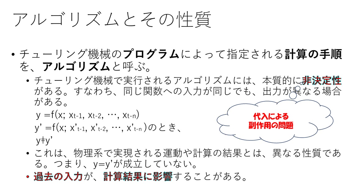 このことは、チューリング機械では、同じ「変数」すなわち、同じ「メモリ」への操作でも、「いつ」そのメモリの値を読み出したかによって、得られる値が変わると言う問題を起こします。これが、銀行口座のオンライン処理などで、口座の残高に誤りが発生する問題の原因になります。つまり、同じ「変数」の参照でも、その前にどのような処理を実施しているかによって、計算結果が変わるのです。このようなことは、数学の式では起こりません。この副作用によって、同じアルゴリズムに基づくプログラムでも、いつプログラムの問題部分を実行したかで、その計算結果が変わります。同じプログラムの記述であるにもかかわらず、計算結果が異なる問題が出ることを、計算の答えが確定していないと言う意味で、非決定性と言います。