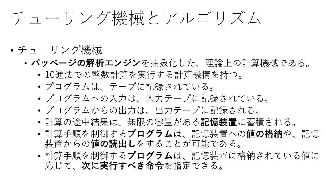 18世紀末のイギリスに、数学者のチャールス・バッベージが生まれました。それは、イギリスの社会で産業革命が進んでいた時代です。そして、ドイツの大学で、哲学者のカントが活躍し始めた頃です。バッベージは、フランスの数学者、パスカルが作り、ドイツのライプニッツが改良した機械式の計算の仕組みを使って、今日のコンピュータの基になった考えを、実現しようとした人でした。その約100年後、アメリカのハーバード大学で、エイケンによって世界最初の電気で動くコンピュータが開発されました。そして、その同時代、ドイツ軍のエニグマ暗号を解いた、イギリス・ケンブリッジ大学の数学者、アラン・チューリングは、バッベージの機械を基にして、現代のコンピュータの基礎となったチューリング機械を考え出しました。