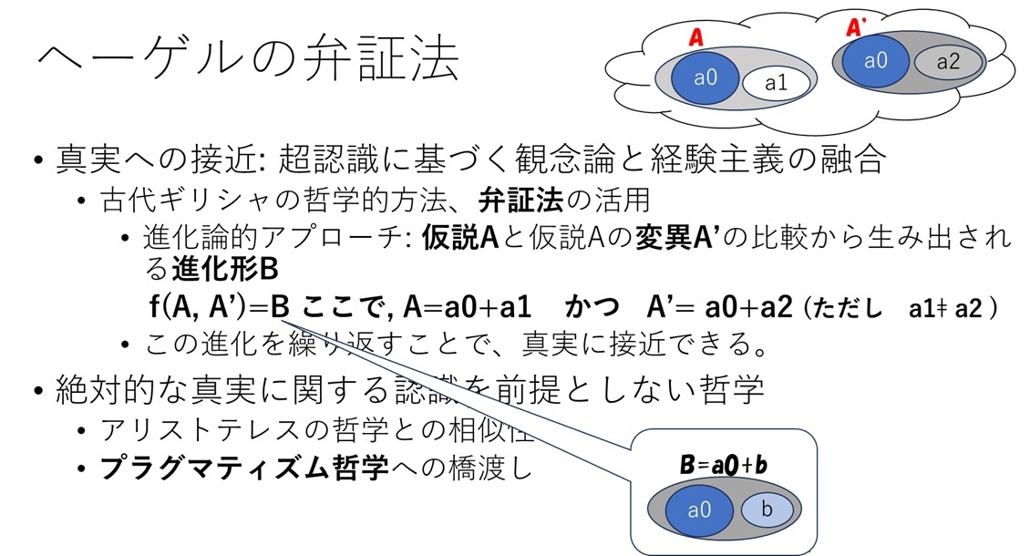 今、ある人が最も正しいと考える案を、細かく吟味すると、項目a0と項目a1の2つの内容を合成して構成されたものであることが理解されたとします。そして、その正しいと思われる案とは正反対の案が、項目a0と、項目a1とは異なり、項目a0とa2の2つの内容から構成されているとします。このとき、弁証法では、この対立している2つの案、AとA’とを詳細に比較して、異なっている項目の、a1とa2との中間、またはa1やa2よりも「より」望ましい、b案をつくり、そのb案と、AとA'に共通する項目a0を合成して、新しい案を作れば、その案は、もとのA案よりも望ましい案になっているはずです。これが、弁証法の基礎です。